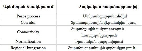- «Միջանցք» նարրատիվ. Պետության ինքնիշխանության ակնհայտ սահմանափակումները դիտարկվում են որպես ռեգիոնալ խաղաղաշինությանը միտված կառուցողական քայլ: Օգտագործվում են՝ «connectivity» (կապ), «trade facilitation» (առևտրի դյուրացում), «անցումային ճանապարհ», և «տնտեսական միջանցք»: Նման եզրաբանության նպատակը՝ քաղաքական ու աշխարհաքաղաքական զիջումները տնտեսական շահավետության հռետորաբանությամբ քողարկելն է, պետական ինքնիշխանության մակարդակի նվազեցումը որպես առավելություն ներկայացնելը: Այս խոսույթը խուսափում է՝ «պետական ինքնիշխանություն», «մաքսային հսկողություն», «անվտանգային իրավասություն («security jurisdiction») եզրաբանությունից: