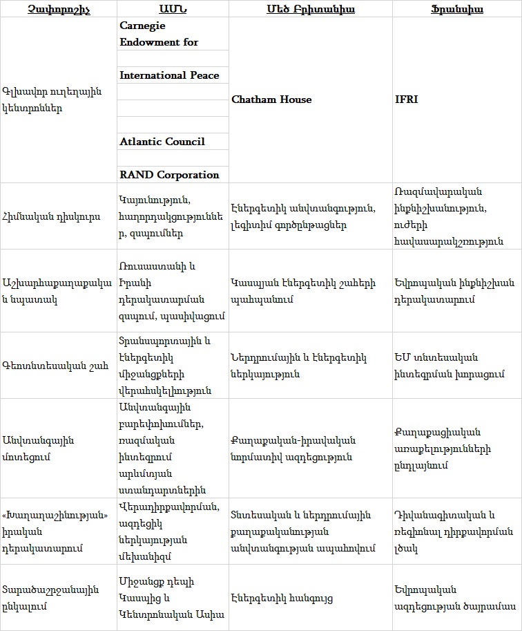 Ստորև ներկայացնում եմ համեմատական աղյուսակ՝ ամերիկյան, բրիտանական, ֆրանսիական 6 հայտնի ուղեղային կենտրոնների մոտեցումների վերաբերյալ՝ Հարավային Կովկասում «խաղաղաշինության» գործընթացի շրջանակում։ Համեմատությունն արվում է քաղաքագիտական մի շարք չափորոշիչների հիմքով՝ անվտանգային մոտեցումներից մինչև գեոտնտեսական շահեր ու նպատակներ, «խաղաղաշինության գործընթացի»՝ իրական, մտացածին ու իրատեսական ընկալումներ: